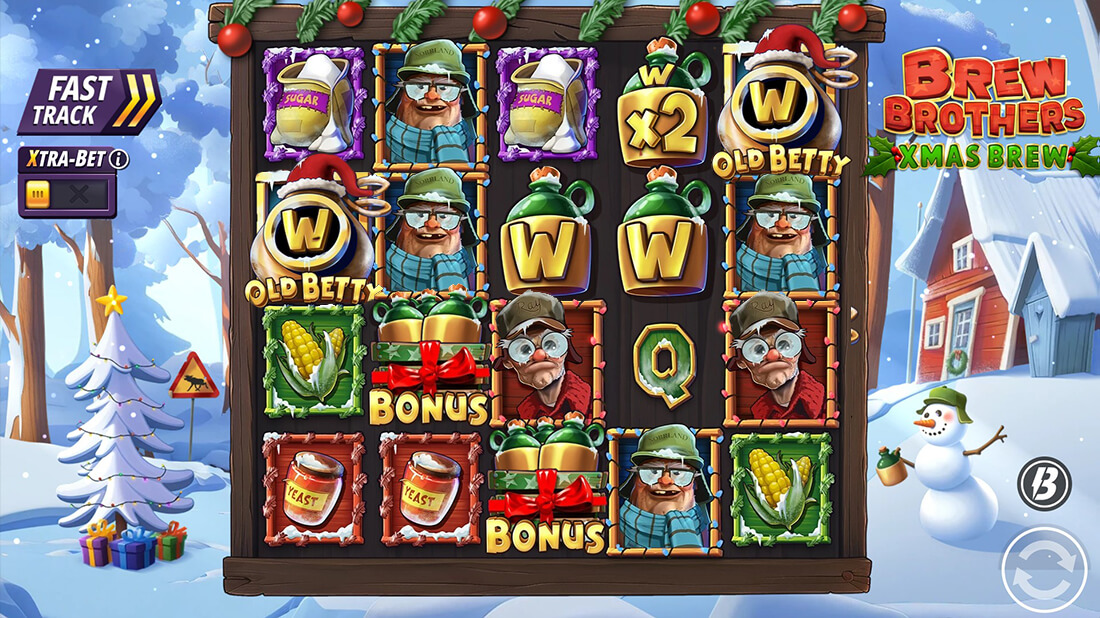 Festive reels are decorated with mugs of frothy ale, holly, candy canes, and the cheerful Brew Brothers themselves. The higher-value symbols are represented by the Brew Brothers, while Christmas-themed card suits make up the lower-value symbols.