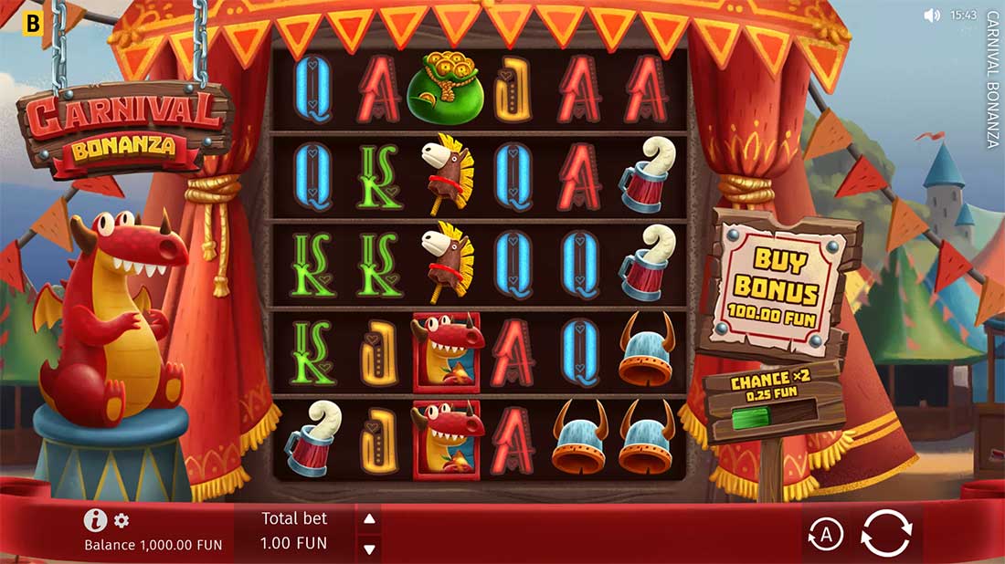 Carnival Bonanza by BGaming invites players to a fairy-tale medieval fair hosted by a cheerful dragon. This high-volatility video slot operates on a 6×5 grid with a Pays Anywhere system, cascading (refill) reels, free spins featuring sticky multipliers, and both Chance x2 and Buy Bonus options for bonus control. With an RTP of approximately 96% and a maximum win potential reaching 14,134× your stake, it’s an exciting and lively choice for players at Stake Casino craving feature-rich action and whimsical visuals.
