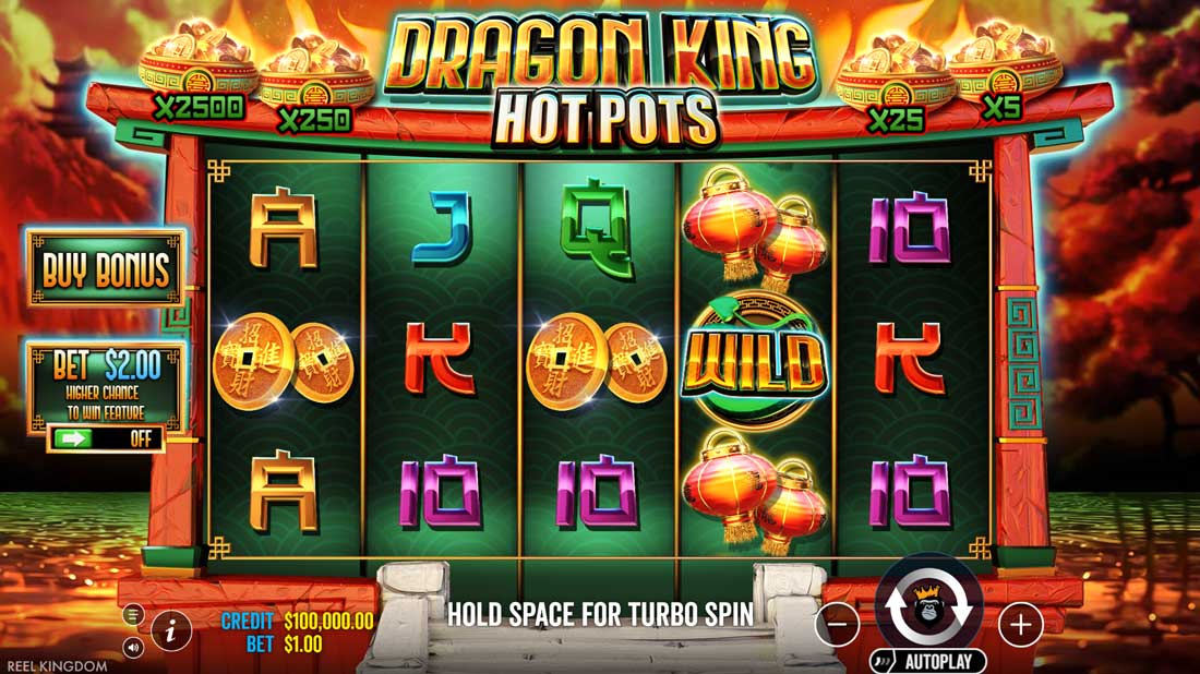 If all mini slots lock, there’s a chance to activate the Dragon King Hot Pots feature, where a single special slot machine spins and awards enhanced prizes up to 2,500× your total bet.