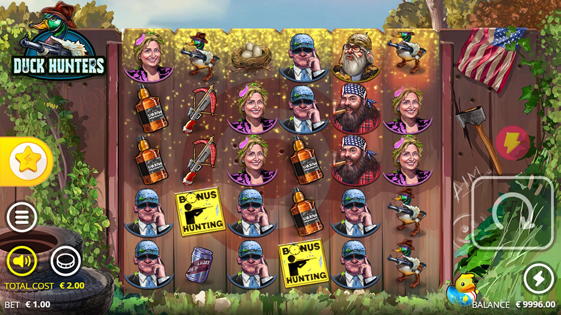 Duck Hunters uses a scatter win system instead of paylines, with winning occurring from having matching symbols anywhere on the reels.