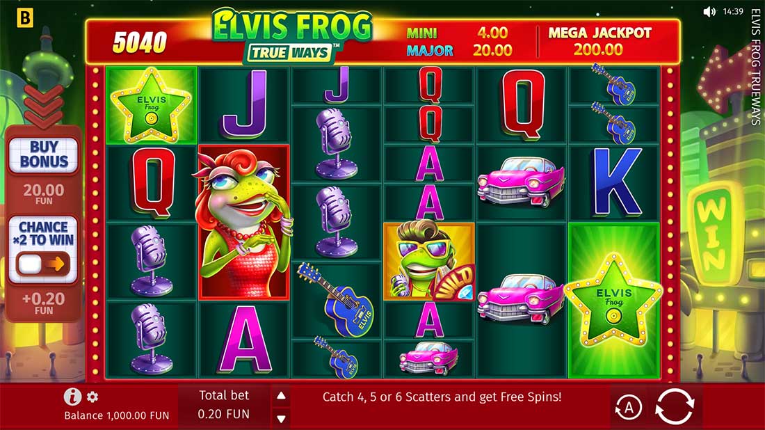 Elvis Frog returns to the stage in full Vegas glamour, joined by his stylish lady friend. The slot embraces vibrant neon lights, colorful animations, and a festive rock’n’roll vibe that captures the essence of the Strip. From guitars and pink cars to dazzling star-shaped bonus icons, every element contributes to the show-like atmosphere. The soundtrack further amplifies the excitement, echoing with upbeat rock energy.