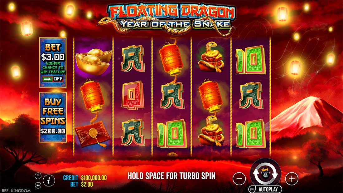 Floating Dragon: Year of the Snake draws heavily on traditional Asian aesthetics. The reels are framed with lanterns, red and gold accents dominate, and symbols include golden snakes, lanterns, red envelopes, and ornate dragons. The soundscape blends ceremonial flair with festive tones — the visuals and audio complement each other to celebrate the Chinese zodiac’s Year of the Snake with elegance and energy.