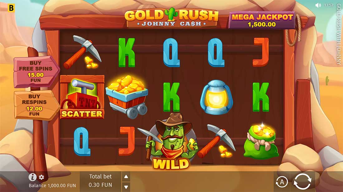 The theme follows Johnny Cash – not the singer, but the charismatic cowboy cactus – on a quest for gold hidden in the mines. The background takes players deep underground, filled with lanterns, carts of gold, and dynamite ready to blast new riches into sight. The visuals are colorful, lively, and cartoon-styled, with Johnny himself standing out as both the Wild symbol and the star of the game. The upbeat soundtrack, with Western-inspired tunes, enhances the adventurous, lighthearted vibe.