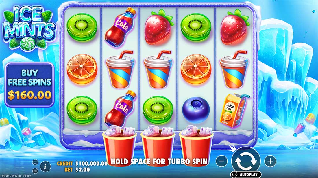 The slot combines icy visuals with a playful mint-candy theme. The reels are filled with cool colors, frosty details, and refreshing graphics. Below reels two, three, and four sit the special “cups,” each holding multipliers of up to 20× on reels 2–3 and up to 25× on reel 4. The overall look is crisp, polished, and distinct from traditional slot aesthetics, making Ice Mints stand out in Pragmatic Play’s portfolio.