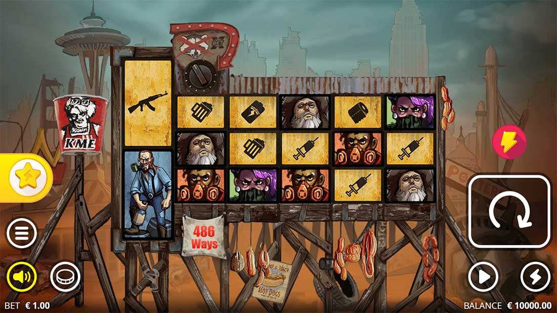 This post-apocalyptic slot features a vengeful “Karen” chasing down hapless men in a grim restaurant wasteland, with raccoon companions, dark humor, and chaotic visuals. The soundtrack echoes the madness with edgy beats and sinister sound effects.