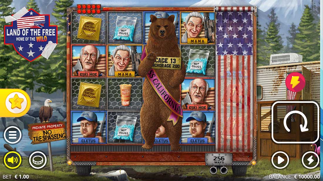 Set against a backdrop of snowy mountains and pine trees, Land of the Free transports players to an outrageous trailer park community. Expect vibrant colors, bold character designs, and a country-style soundtrack that matches the game’s comedic yet chaotic vibe. Main characters like Mama, Eski Moe, Cletus, Trailer Swift, and A$$man each bring their own brand of mischief to the reels.