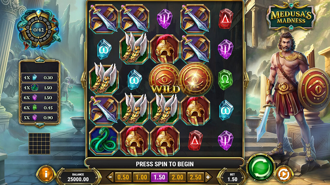 Medusa's Madness includes a Cluster Pays system, where winning is achieved by creating clusters of five or more matching symbols horizontally or vertically. A cascading reels mechanic also boosts winning chances as new symbols fall into place, creating further potential clusters.