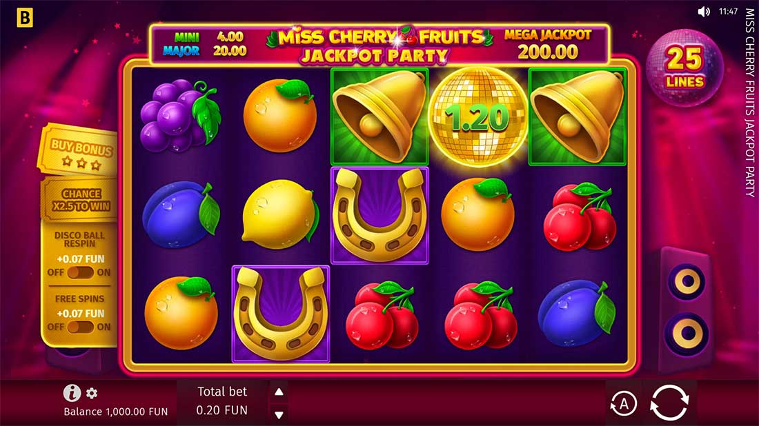 Miss Cherry Fruits Jackpot Party invites players to a retro disco-themed fruit fiesta powered by neon lights and party vibes. The grid is adorned with juicy classics—cherries, lemons, plums, grapes, oranges, melons, horseshoes, and bells—spiced with shimmering disco balls and a lively soundtrack. The host, Miss Cherry, adds personality as a Wild, keeping each spin spirited and engaging.