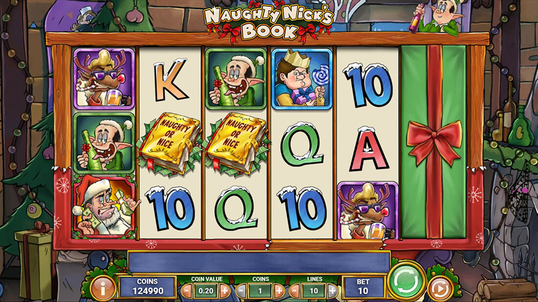The Naughty Nick's Book symbols are a blend of cheeky holiday characters and traditional card ranks. High-paying symbols include Naughty Nick himself, Rudolph, and other mischievous holiday icons, while the lower-paying ones are represented by A, K, Q, J, and 10. The Book is both the wild and scatter, substituting for others and triggering the bonus round when three or more appear.