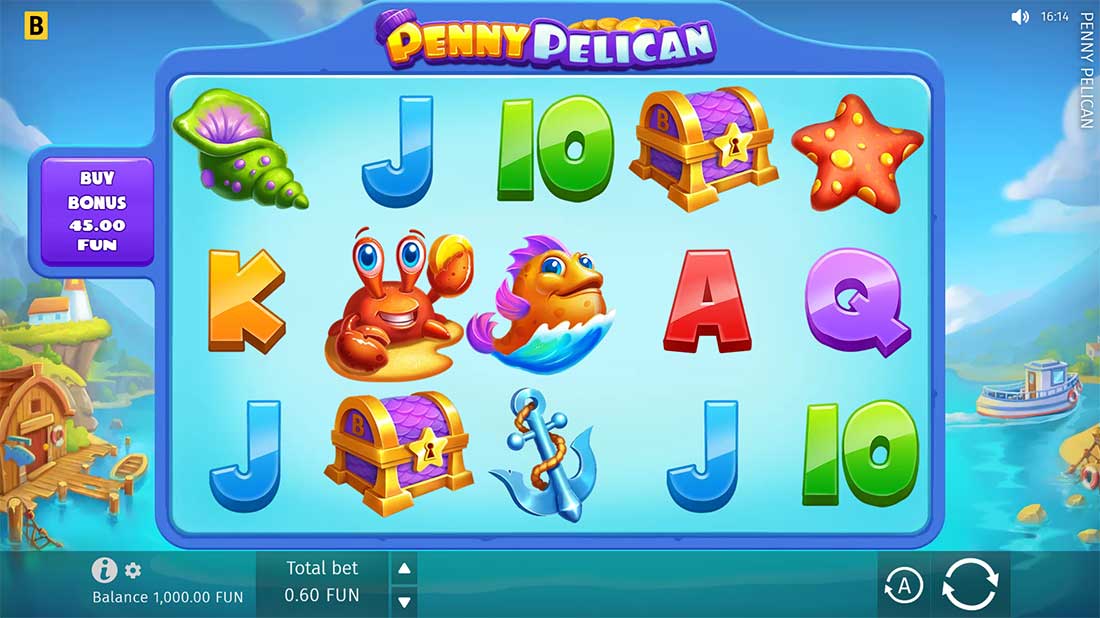 Set against a vibrant marine backdrop, Penny Pelican brings a cheerful coastal theme to life. Cartoon-style symbols include a pelican-themed Wild, fish, crabs, treasure chests, anchors, shells, and playing card icons. The animated visuals and upbeat soundtrack—featuring seagulls and soothing waves—create an immersive seaside experience.