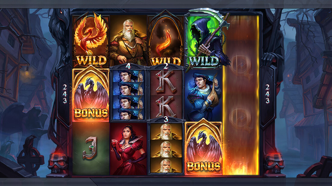 Phoenix Graveyard features dynamic reel mechanics with up to 243 win ways, including transforming symbols, walking wilds, and jumping wilds that enhance gameplay and increase win potential.