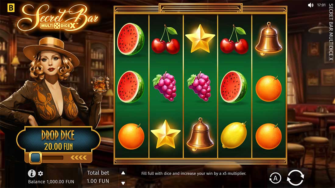 Secret Bar MultiDice X transports players to an intimate 1920s speakeasy, blending classic fruit-slot visuals with an innovative dice-powered multiplier system. This medium‑low volatility slot features 243 paylines on a 5×3 layout, offers a generous 97.33% RTP, and delivers a solid 2,500× maximum payout. Its standout mechanic, MultiDice X, elevates each spin with unpredictable multiplier potential via dropping dice.