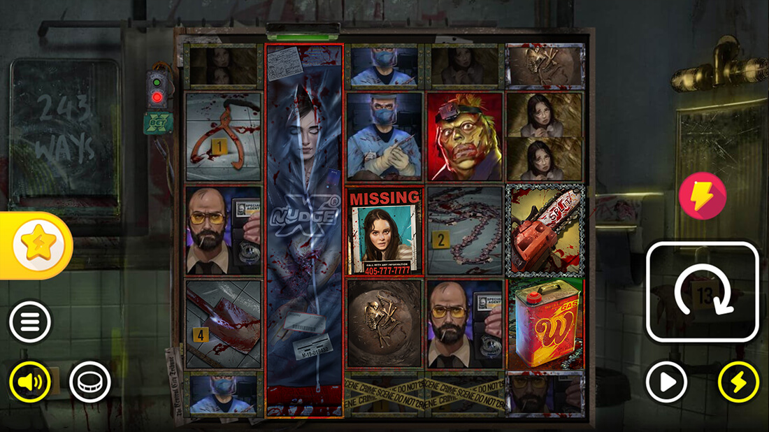 The game delves into a sinister serial killer theme, with gameplay set against the backdrop of a grim crime scene. This theme is intricately designed with elements and symbols tied to a murder investigation, wrapped in a suspenseful atmosphere.