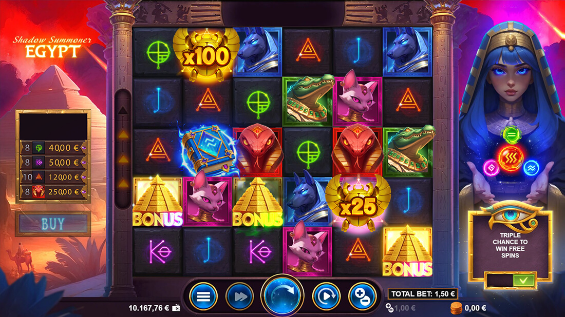 Shadow Summoner Egypt does not use traditional paylines, instead utilizing a Scatter Pays system. Wins are achieved when a set number of matching symbols appear anywhere on the reels. This increases the chances of multiple wins per spin, especially when combined with cascading mechanics.