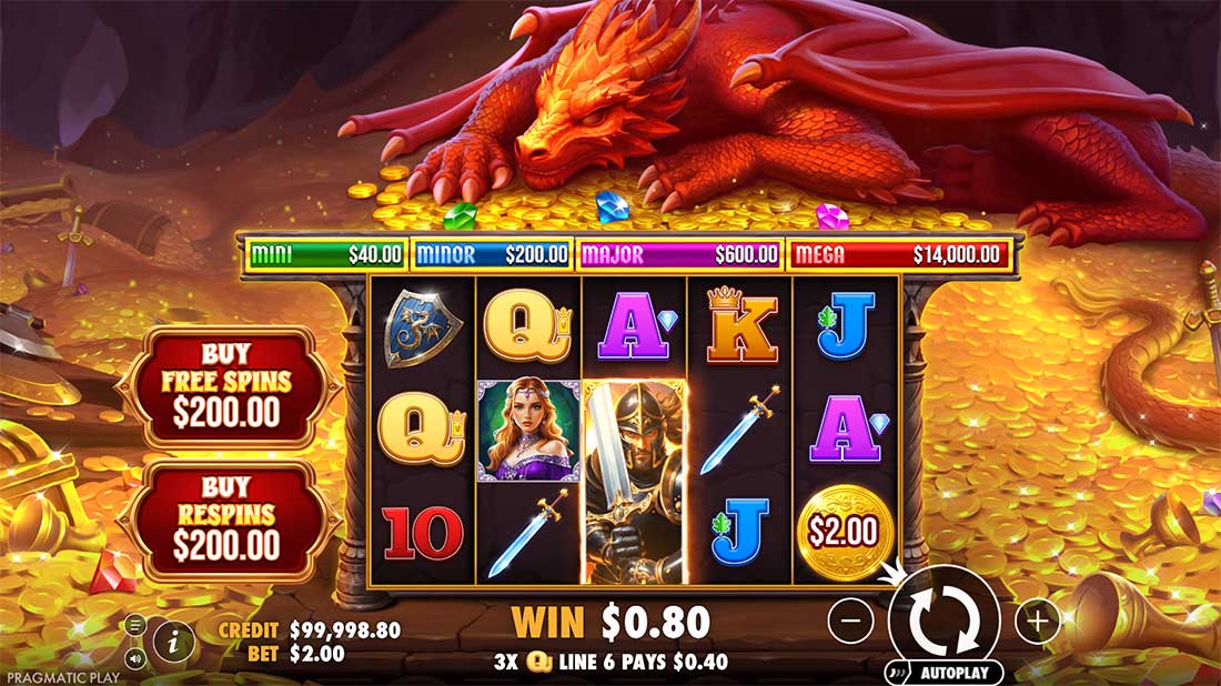 The game is set in a dark cave where a dragon guards its treasure. Symbols include a princess, crown, shield, sword, and card royals, while wilds and money coins provide special features. The soundtrack builds suspense, reinforcing the mythical fantasy theme. During free spins, reels 2–4 merge into a giant reel, adding cinematic tension.