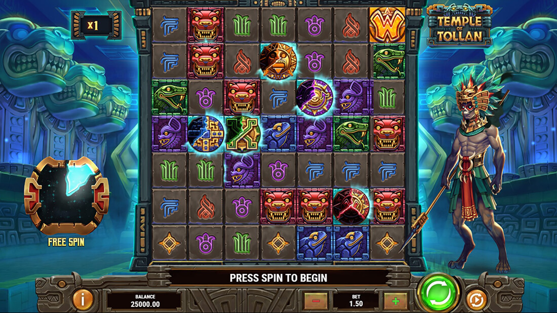 Temple of Tollan is a cluster pays game, meaning a player wins if at least four identical symbols appear in a cluster. Of course, the cascading feature means that multiple wins can be achieved from one spin, as new symbols fall into place after every winning cluster has been removed. Added to this, special symbols and the Free Spins feature really open up the possibility for big wins.