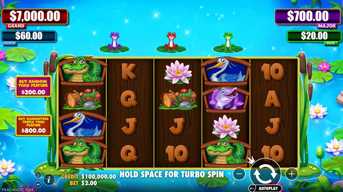 Tiny Toads radiates a fairytale glow, set in a lush marsh where frogs guard mystical orbs of light. The reels shimmer with wildlife – crocodiles, birds, and fish – alongside flowers and wooden treasures. The animation is smooth and colorful, while the soundtrack brings a mix of playful notes and mysterious hums, echoing the charm of a moonlit pond. Pragmatic Play has once again mastered the balance between whimsy and high-stakes action.
