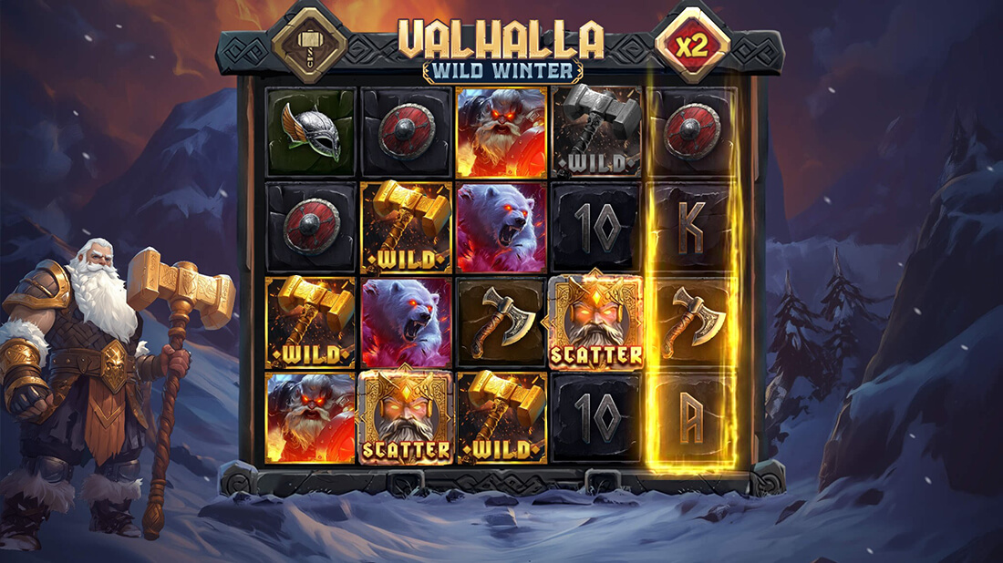 Valhalla: Wild Winter is a traditional payline-based slot where wins are achieved by matching symbols on adjacent reels from left to right. The medium volatility of the game means that it provides a good balance between frequent smaller payouts and the occasional larger win.