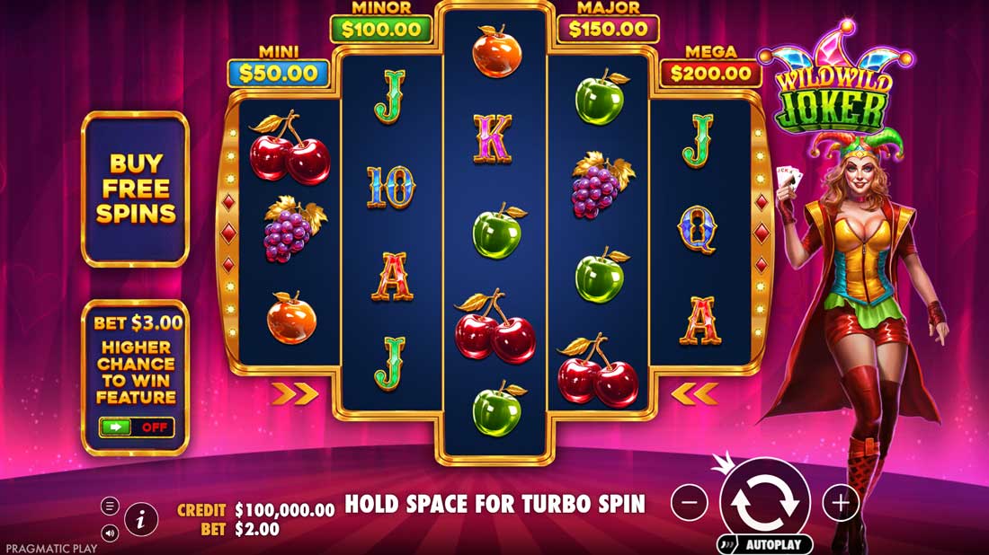 Wild Wild Joker captures the atmosphere of a neon-lit casino floor, merging classic fruit symbols — cherries, apples, grapes, oranges — with modern animation and a sleek interface. The Joker herself, appearing as the Wild, adds energy and mischief to the reels, while bold graphics and a funky jazz soundtrack amplify the excitement.